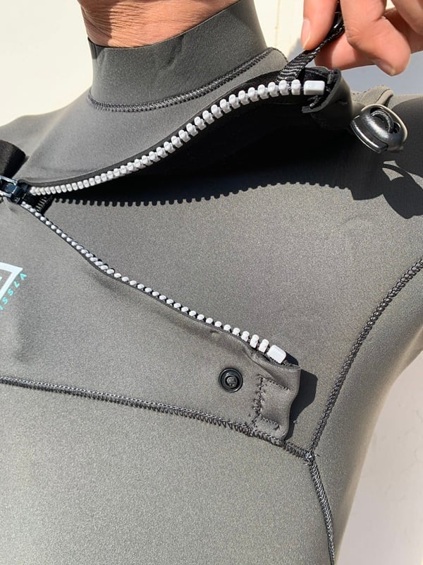 ごわつかず、防水性に優れているチェストジップエントリー。石灰岩原料のスーパーストレッチ素材で容易な脱着、より自由な動きを実現してます。